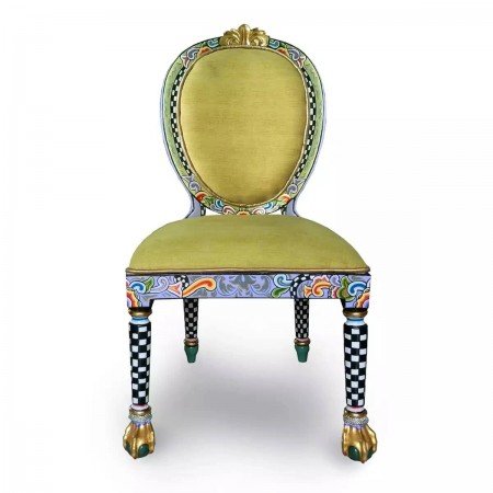 Les quatre pieds sculptés, ornés d’un damier noir et blanc et terminés par des griffes de lion dorées, donnent à l’ensemble une allure théâtrale et majestueuse.